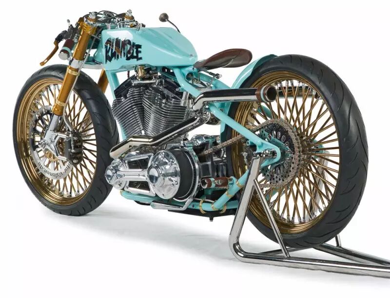 如果你再仔细些观察,就会发现“大轱辘”身上的悖论可真不少——前端安装了倒立式前叉和下压式把手,形成了强烈跑车风格;但是后倾角多达40度,比常规的巡航车还夸张!同样构成悖论的还有动力和轮胎:“大轱辘”搭载的是Rev Tech发动机,排气量高达1800cc;与之形成反差的是轮胎,后胎规则仅为130/60,令人怀疑能否有效承接大双缸的滂沛动力? 换挡机构同样让人吃惊。与常规的脚踏换挡杆不同,“大轱辘”通过复杂的连杆机构,在油箱右侧安装了手动换挡杆——当最现代的跑车都在采用快速换挡系统的时候,“大轱辘”反其道而行之,就像汽车那样用手动换挡杆来改变挡位,实在有些令人抓狂!