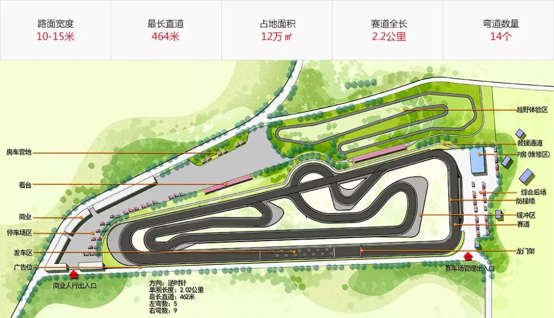 14个弯道,最长直线距离464m,路宽10-15m,行驶方向顺时针。