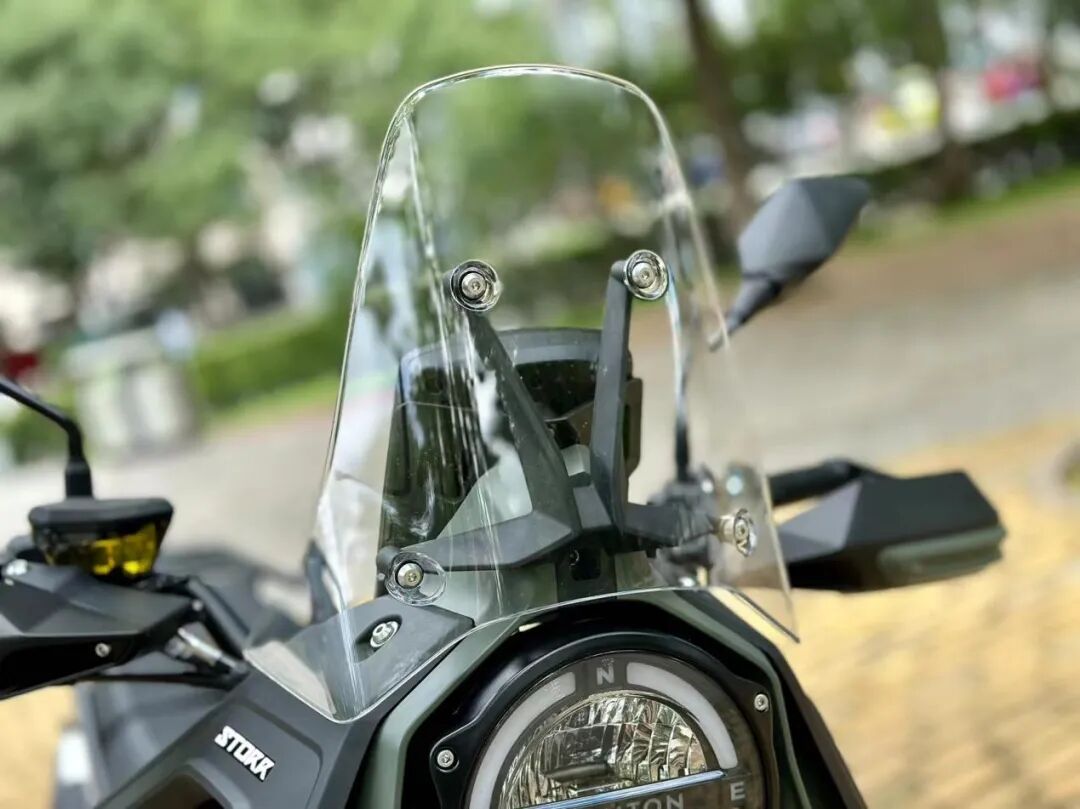 为了确保仿生学外观造型,风挡设计没有走传统路线,实际使用效果可以对1.78米的骑士胸部起到一定风阻保护效果,肩膀和头部的阻风效果稍弱。如果跑长途摩旅,可后期更换。