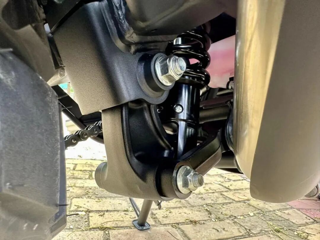 钢管编织车架配合双钢管的后摇臂,韧性有了,可靠性有了,重量不知,但看着很轻巧,与国内一众铝合金后摇臂和单悬挂的结构泾渭分明,眼前一亮。